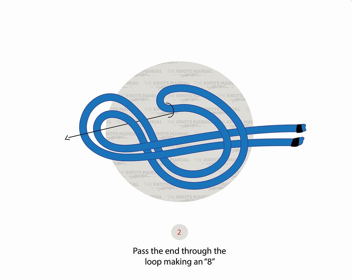 To tie this knot, start by creating a long bight (10-20 inches). Then create a Figure 8 Knot, but don’t tighten it yet (steps 1-2). Reverse the end of the bight through the last loop (step 3), but not fully. And lastly, move the end of the bight around the whole knot, and pull the two loops to finish the knot (steps 4-6).